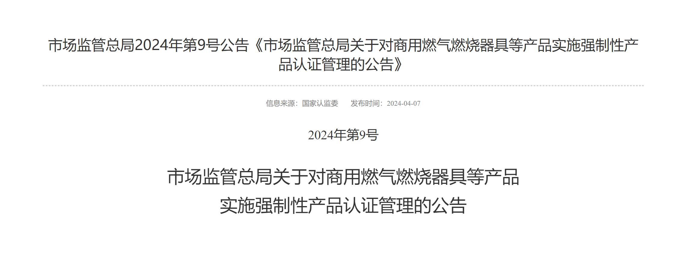 市場監(jiān)管總局2024年第9號公告《市場監(jiān)管總局關于對商用燃氣燃燒器具等產(chǎn)品實施強制性產(chǎn)品認證管理的公告》